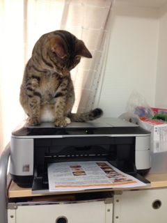 プリンターから紙が出て来るのが不思議みたい。プリントアウトする度に不思議そうな顔をして、プリンターの上で観察。