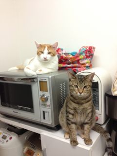 最近、ママが夕食の準備をしていると、こうして二人して後ろからウォッチしているんです。手抜きしていないか監視されているようでニャンズの視線が背中に刺さり…やりづらい(苦笑)