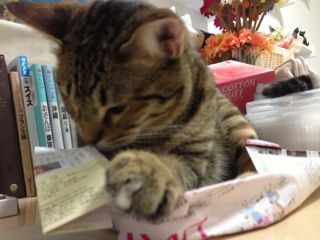ママが絵を描く時、新聞紙で作ったゴミ箱を使うのですが何を思ったのかソナタが入ってしまいました。もちろん、わずかに小さくペシャンコになっていますが…。