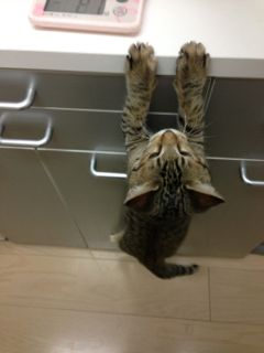 パパとママが帰って来て、大喜びのニャンズです。ただいまのギューをしてあげたら、ソナはまっすぐネコトイレへ。でもトイレではなく、トイレの外でウンウンしちゃった!!