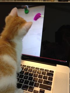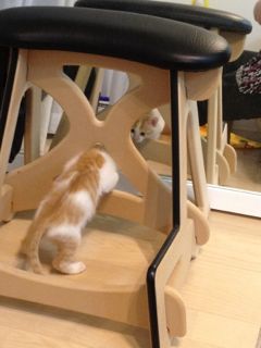 ごはんもカリカリになっていたし、ものすごくしっかり食べるところも見せて頂きました。連れて帰りたいー。でもメルのことを考えると大丈夫かなぁと思いつつも、連れて帰りたい(笑)本当は6月中旬ぐらいの引き取りを考えていて、移動に慣れてもらおうとキャリーバックを預けるつもりで持参したのですが…。「連れて帰りたいでしょ?」の保護主さんのお言葉に心がグラグラ。連れて帰りたいけれど、まだ早いような気もするし、でも連れて帰りたい…。「もう大丈夫だと思いますよ。それに今は預かっている身なので、メルちゃんに何かあってもね。可愛い子だから情が移っちゃっても」と、保護主パパさん・ママさんからのお許しを頂いて引き取ってきました。 電車の中、不安なのかもぞもぞ動いていたメル。かと思うと、寝てしまったり…を繰り返していました。家に着いたら初めは恐る恐るでしたが、段々慣れて来たのか走ったり跳ね回ったり。 ソファの下に潜ってリビングを探検したり、チェロ椅子や譜面台の脚をくぐったり、鏡に映る自分を不思議そうに眺めたり。でもソファの下に潜っていても「メル」と名前を呼ぶとちゃんと来てくれます。ケージの天井からおもちゃを吊るしてあげたら大喜びで猫キック!2本足で立って猫パンチ☆ 保護主さん宅でいっぱい遊んで、急遽引っ越しになって、新しいおうちでいっぱい遊んでだいぶ疲れたようです。よじ登って来たと思ったら、ひざの上で寝てしまいました。甘えっ子ちゃんなんだねぇ♪
