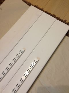 一夜明けて今朝、2x4材の位置を再調整して、棚板に取り付けたプラケットを取り外しました。すでに穴を開けてしまっているので、下から5mm上、端から3mmぐらいのところに留め直し。この時のポイントは、棚板を2枚並べて設置する場合を考慮してプラケットの位置を決めること。棚板の長さ30cm=隣り合う柱の中心線と中心線の間、2穴のガチャ柱は中心線から左右にズレたところに穴があるので、その差分を計算して取り付けなければなりません。