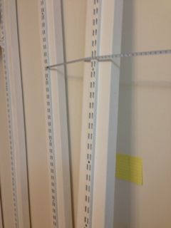 でも設置し始めたのは良いのですが…2X4材の位置とポストイットの位置が微妙にズレるわけです。なぜかというと、2X4材を立てる時に棚板がきちんと収まるように、ガチャ柱の差し込み穴を基準に計って、棚板をはめ込んで確認してから次を設置…を繰り返したため。ここでもミスを犯していたことに気付けば良かったのですが、だいぶ疲れていて早く終わらせたいと、そのまま突進してしまったのです。結果的にどうやっても最後の幅が51cmしか取れなくて、53.5cmの棚板が設置できないという状況に…。
