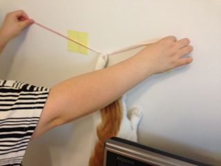 壁にはあらかじめ2X4材を立てるところに、メルとソナタの助けを借りつつ(笑)、目印のポストイットを貼っておきました。実はこれ、キャットウォークを作ろうと決めた時に、壁と棚板の幅を計算し、2X4材の幅に合わせて切ったポストイットに中心線を入れたものを貼って、イメージしやすいようにしていたのです。イメトレ期間は丸っと2週間!その間に我が家に来られた方は「なにこれ?」と不思議に思っていたことでしょう(笑)