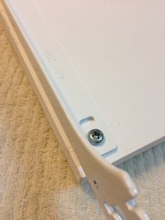 ネジ(なべタッピング)で棚板にプラケット留め。この時は何も考えずに、板の端に合わせて取り付けたのですが、これが大きなミスの1つに…。これについては後述参照。