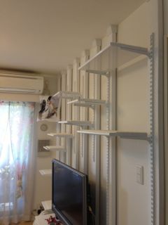 そんなこんなで、やっと完成!!出来上がってみると、全然圧迫感もなく、デッドスペースを存分に活かせて、その上、棚の可動で変化をつけることができる、すごいキャットウォークですね〜。「Dear Wall」というネーミングもなるほど納得。このキャットウォークの設計はディアーウォールとの出合いが発端だと思いますが、ホント素晴らしいアイデア!ブログを参考にさせて頂いたおっさん様とミニ子様には心から感謝です♪