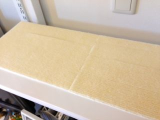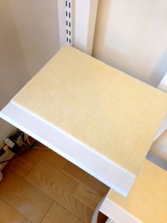2X4材を乾かしている間に、滑り止めマットを棚板の手前から1cm下げた位置にカットして、下から見上げた時にあまり見えないようにちょっぴり工夫。が、53.5cmの棚板用のマットが圧倒的に足りない! なので、手前から4cmまでマットが来るようにカットし直して、53.5cmの棚板は余りのマットを敷き詰めることで問題を解消しました。つぎはぎになっちゃったけどね(笑)本当は横も少しカットして下からは完全に見えないようにしたかったのだけど、難易度が高い&時間がかかるのでやめました。マットは強力両面テープで貼っています。