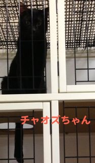 ケージを引き取られたアヤカさん宅の「チャオズちゃん」。「黒いんです」とは言っていたけれど、こんなに綺麗に真っ黒!この画像ではお顔が見えないのですが、とても賢そうな顔をしています。板穴から垂れたしっぽがまた可愛い♪ ケージが白だから黒いチャオズちゃんとのコントラストばっちり☆