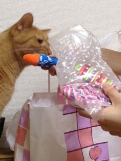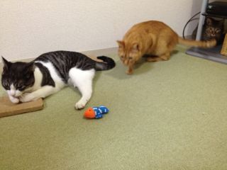 ふくちゃんはお肉好き、ゆでたお肉をおいしそうに食べます。はっちゃんは野菜好き、レタスの葉の柔らかいところをむしゃむしゃ。芯の固いところは食べないんだって。おいしいところをよく知っています(笑) 3匹それぞれにお魚のおもちゃをプレゼントしました。特にゆうきちゃんが一番気に入ってくれたようで、なかなか手放してくれなかったよ。ふくちゃんも興味津々だったけれど、妹のゆうきちゃんにおもちゃを譲っていました。さすがお兄ちゃん、偉いな〜。