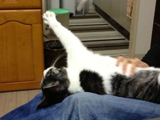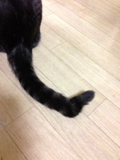 マリコさん宅の3兄妹も元気でした!大きな目が特徴の長男・福ちゃん。緑色の目が魅惑的。しかも幸運の印を言われるカギしっぽ。ホントにくりっとなっているのね。福ちゃんはマリコさんの膝の上で、ゴロゴロ。なすがまま、されるがままでのびのびとしています。そんな姿にほのぼのするよ♪