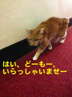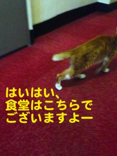 ちゃんと食堂に案内してくれました(笑)この可愛らしい仲居さんの他に、グレー一色の猫ちゃんもいるのですが、こちらはとっても恥ずかしがり屋で、目が合った途端にぴゅーっと受付に隠れてしまいました。なかなかお目に掛かれない幻のニャンコだそうです(笑)パパもママも会うことが出来たから、きっといいことあるかもねー♪