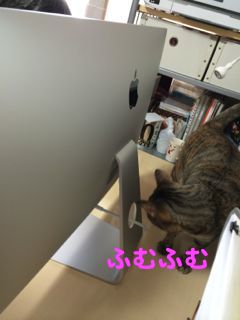 メルちんによって卓上水没したMacBookProに替わって、iMacが届きました。早速、理系の猫姫様による点検が。