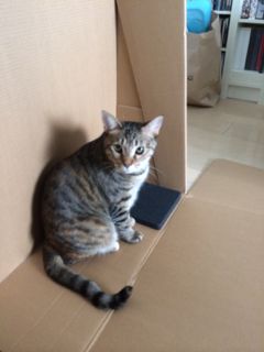 iMacが入っていた段ボールに入っていたソナタ。箱を開けられてきょとんとしております。では!写真撮影も終わったので、箱閉じますね。失礼しました〜♪