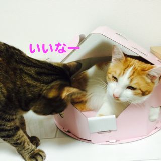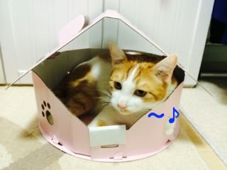 「ねこのきもち4月号」についていたハウス型段ボール。袋から出した途端に「ボクの?ボクの??」と催促がすごいメルちん。組み立てたら早速IN!