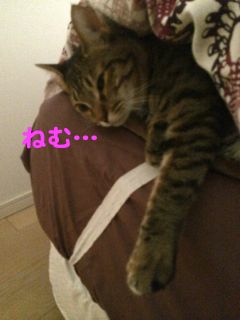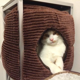 風邪でダウン中のママ。サイドボードにぴったりの大きさのニャンコベッドから、メルが見守ってくれています。