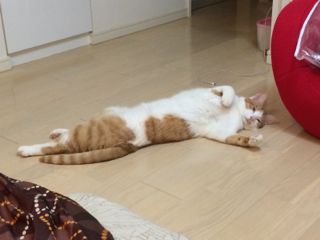 それでも暑くなると、こうしてフローリングで涼をとるメルでした〜。