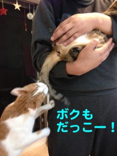 パパにだっこされてゴロゴロご機嫌のソナタ。さっきから「ボクもボクも」とおねだりしているのに、ソナタが全然下りようとしないので、ソナタのしっぽをかぷっ!