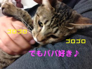 パパ独占状態でご満悦のメルちん。ソファにいる時は決まってパパにベッタリ。そういえば子猫は飼い主を選ぶそうですね。お見合いの時にメルはパパから離れようとしなかったから、パパはそれが大の自慢♪ そしてこうしてメルが寄り添ってくれるのもたまらないみたいです♪♪