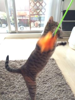 猫じゃらしに反応しても寝転がったままで起きようともしないソナタが、珍しく必死に猫じゃらしで遊びました。急にどうしたんだろ??