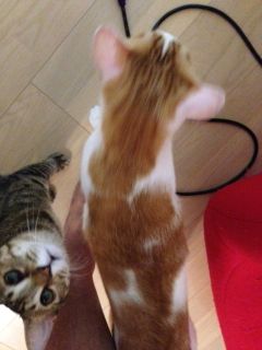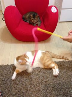 ニャンズは”ねこのきもちねこじゃらし”でいっぱい遊んでもらいました。いつも通り、ソナタはメルよりも一段高いところから、しかも座って動かず、ねこじゃらしが自分の目の前に来た時にしか手を出さないという横着ぶり…(苦笑)メルはねこじゃらしをひたすら追いかける!!その必死さが可愛いんだよね〜♪ いっぱい遊んでもらったニャンズ、ノゾミさんが帰宅された後は、幸せ気分いっぱいでぐーすか寝ております。ノゾミさん、ありがとう!また来てね♪