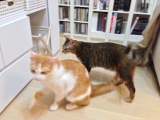 夕方からノゾミさんが遊びに来ました。ノゾミさんと言えば、ご自宅に御年23歳になるマリーちゃんがいるんですよ〜。ニャンズはパパのお部屋の窓からノゾミさんにご挨拶、そして玄関では二人揃ってまた挨拶しにきました。ちゃんと覚えているんだね。