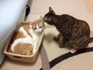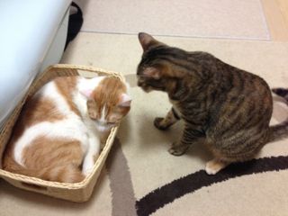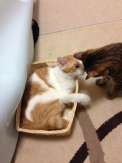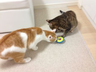 仲良くプレイタイム☆ この前、あーちゃんがくれた猫じゃらしがクルクル回るおもちゃ。5分後には分解されていましたけどね…。