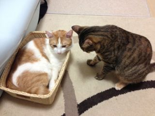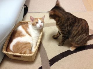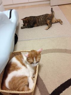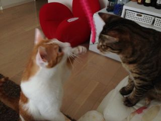 こちらは「ねこのきもち」9月号の付録のねこじゃらし。もう二人とも夢中です。でもおもちゃで遊ぶとなると、