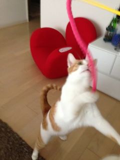 積極的なのは断然メルの方!目の色変えて、ステップを踏みながらサーッと走って来ます。動きも速いし、もうすごい食いつきよう。ソナタはおもちゃになるとあまり積極的にはならず、じっと見つめてちょいちょいと手を出す程度。