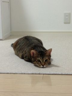 着々と涼む場所を確保しているメルです。今度はママの花材棚の上。ここは真ん中にタイルが入っているので、ひんやりしているんですよね。