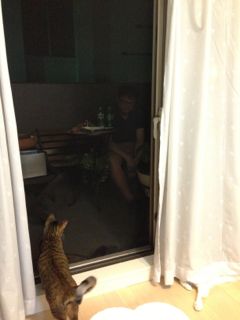 お風呂上がりのパパが、ビールを持ってベランダガーデンで涼み中。ソナ姫はパパが気になるらしく、ニャーニャーとアピールしながらずっと窓で張ってました。
