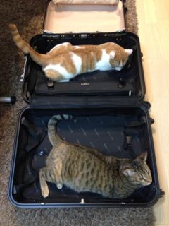 帰国後、すぐにニャンズをお迎えに行きました。今回も二人ともお利口さんだったみたいです。先生や看護師さんにたくさん遊んでもらったらしく、キャリーバッグの中から「遊びたい、外に出して」と大騒ぎ。夜はアキコさんが遊びにきたよ☆