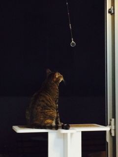 窓にぶら下げているサンキャッチャー。我が家のベランダはひさしが長いので、光が当たってキラキラ光ることはなく、すっかりソナタのおもちゃと化しています…。そしてなぜか夜になると遊ぶソナタ。