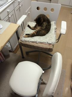 チェアマットがあろうとなかろうと椅子を取られることが分かったので、ソナタがママの椅子で寝ているときは、レッスン用の椅子を使うことにしました(笑)