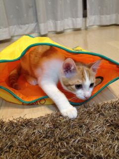 ママが好きなビオリストさんのブログで、ニャンコちゃんが遊んでいる写真を見ていて、メルを引き取ることになった時に真っ先に買ったおもちゃ。でも当初メルにはまだ大き過ぎて全然遊んでくれなくて、あっという間にお蔵入り。やっと遊んでくれる大きさになったので、試しに出してみたら大喜び!