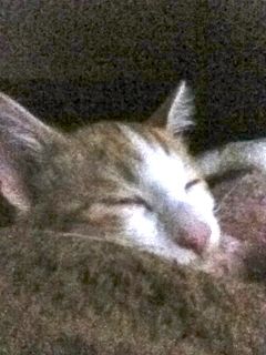 パパとママのベッドはメルにとっては「解禁」の場所。寝室以外の部屋では甘噛み(のつもりらしい)だし、滅多に足に噛み付くこともないのですが、ベッドの上では足噛みありの本気噛み。思いっきり遊べるところだから、なかなか寝ない(笑)ほったらかしにして寝ようとしても、顔や体の上をぴょんぴょん飛び跳ねるので落ち着いて寝れません。でも遊び疲れたのか、パパとママの枕の間でぐっすり寝始めました。川の字というよりも頭が3つ並んで「・・・」で寝ているというのが正しいかも。これからは毎晩一緒に寝ようね♪ でもちょっぴりおとなしくしてね(笑)
