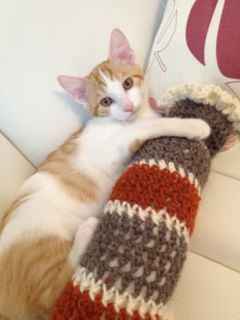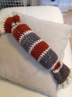 余った毛糸でキャンディの形をしたクッションを編んであげました。抱き枕にでもしてくれれば、と思って。早速、抱っこして寝てくれました♪