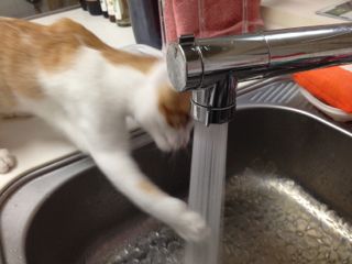 キッチンカウンターに登って、シンクを覗きこむのがマイブームなこの頃。特にシャワーにするとなぜか触らずにはいられないみたい。手をびっしょびしょにして遊ぶんです。おかげでフローリングはところどころ濡れていることもしばしば。メルの気を引かないように、キッチンの照明はなるべく消していますが、「あれ?メルがいない?」と思うと、シンクで横になって涼んでいることも。メルはメルなりに、涼み方を知っているんですね。
