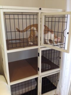 新しいメルハウスは高さ130cm。ゆったり幅の3段です。ケージというよりもマンションみたい!好奇心旺盛のメルは早速中に入ってチェック。これならトイレの砂も飛び散らないし、思いっきり遊べるね♪