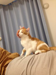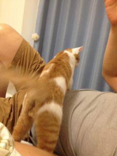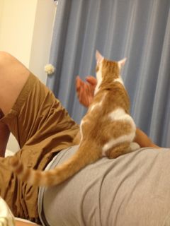 パパのおなかの上に乗って甘えます。たくさん撫でてもらったら、じーっと見てキッチンへ誘います。それでも起きない時は、サイドボードからパパのおなか目がけて飛んでくる始末…3kgのメルがぼーんと飛んでくるから、時々パパも「うっ」なんてうめき声を上げています(苦笑)