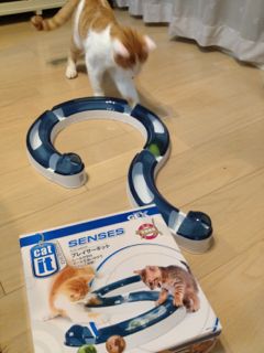 JOKERで購入したおもちゃを開封。このおもちゃ、本当によく出来てる!めちゃくちゃ猫心をくすぐります。レールを好きなように組み合わせできるのが特徴なのですが、なんと言っても、中にあるボールが取れそうで取れないこの隙間感覚!しかもニャンコは隙間に手を入れてボールを取ろうとするから、ボールが加速して…という仕組み。ニャンコが飽きない限り半永久的にボールが行ったり来たり。
