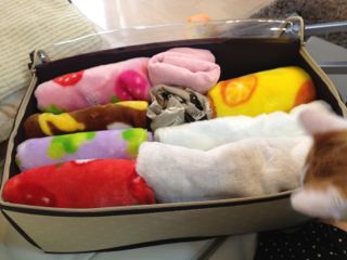 メルの毛布やベッドカバーは衣服ケースにまとめて。これ、全部メルのなんです(笑)色々と替えがあった方がいいかなーと思って、毛布はフルーツ柄シリーズで揃えました。こういうところがパパに「過保護」と言われる所以の一つかも(苦笑)