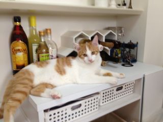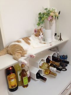 キッチンカウンターの一番端は、インテリアも兼ねてワインなどを置いていましたが、ワイン類はカウンター下の棚に。もともと棚の上には写真立てが並んでいたのですが、写真はフレームを替えて壁掛けに。こうして高いところが好きなニャンコの場所を作りました。メルもご満悦でゆったりしているし、ワイン類を棚の上に移動したらインテリアというよりも、コレクションという感じになりました。この方がメルにとっても安全ですし地震対策にもなる。パパも「置ける場所が増えた!」と早速ワインを買い足していましたよ(笑)