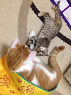 今日はケージ越しの面会15分、Face to faceでのご対面5分です。メルがお兄ちゃんだからなのか、それともニャンコの世界でも女子が強いのかは分かりませんが、かなりのソナペースになっております。メルの方が体が大きくったって、ソナも負けじと…というかそれが普通のようにちょっかいを出します(笑)