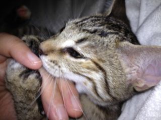 母猫とはぐれたらしく、鎌倉のお稲荷さんの橋の下でうずくまっているところを保護されました。保護主さん宅では家の事情で引き取ることが出来ず、病院に預けられること3週間。優しい先生と看護師さんに大事にケアされて、そして毎日保護主ママさんが様子を見に通って下さったこともあり、風邪も治って毛並みもツヤツヤ、元気な美人さんになりました♪