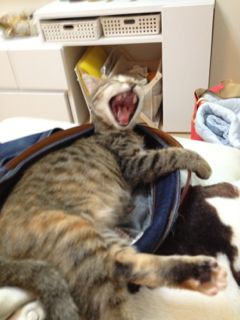 ソナ姫は構ってくれる人がいないのでつまらなさそう。咳をするメルを心配そうに見上げていたけれど、そのうちにパパのジーパンに入って寝てしまいました。ソナもまだくしゃみが出ているし体温も少し高めだから、心配なんだけれどね…。おまけにパパまで「頭が痛い…」と早めの就寝。メル家はママを除いてみんな体調不良。3人の負のオーラと心配でママもダウンしちゃうかも。