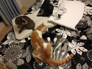 でも一番のお気に入りは大人ベッド。パパと二人でベッドメイキングをしていたら、ニャンズもやってきて大騒ぎ。メルはシーツに潜って出て来ないし、ソナはサイドボードからダイビングしてくるし、二人でぴょんぴょんうさぎのように飛び跳ね回って、なかなか作業を進ませてくれません。お取り寄せで2週間待ちだった新しいシーツセット、やっぱり一番乗りはニャンズなのね…。