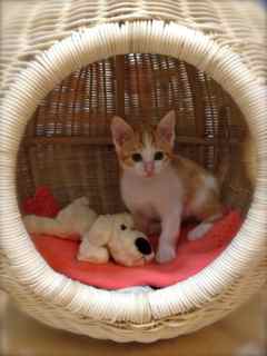 母猫とはぐれたらしく、鎌倉のお稲荷さんの橋の下でうずくまっているところを保護されました。保護主さん宅では家の事情で引き取ることが出来ず、病院に預けられること3週間。優しい先生と看護師さんに大事にケアされて、そして毎日保護主ママさんが様子を見に通って下さったこともあり、風邪も治って毛並みもツヤツヤ、元気な美人さんになりました♪