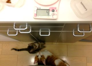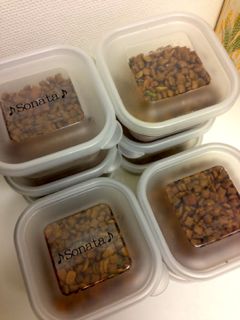 食べ盛りのメルとソナはいつも「ごはんくれー」攻撃がすごいです。年齢が若干違う二人なので、もちろん食べる量も違います。かといって、都度都度計るのも面倒なので、密閉タッパに5日分ほどまとめて小分け。その作業をしている時は、何を期待するのか2人揃って足元でウロウロしまくり、待ってますビーム照射しまくり、立ち上がっておねだりしまくりでちょっと大変(笑)
