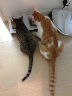 ごはんをあげると、毎回こうして二人並んで仲良く食べています。この瞬間が、二人が一番静かになる時間(笑)