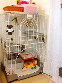 メルのケージは成長に合わせて2段に出来るタイプです。初めは1段にしていたのですが、狭いのかバタバタ暴れまくっているようで、帰宅するとすごい状態になっていることがしばしば。リビングのソファにもジャンプして登れるので、ケージを2段にしています。段ボールベッドの屋根から2段目に登って、ここで涼んでいたり、天井から吊るしたお人形で遊んだりしています。2段目から3段目にはまだ行けない様子。